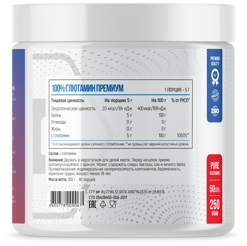 Добавка 100% L-Glutamine одинаково хорошо подходит как новичкам, так и профессионалам. Она изготовлена из высококачественного сырья и прошла несколько ступеней обработки. Более того, формула добавки лишена сахара, красителей и ароматизаторов. Вы получаете исключительно чистый 100% Глютамин в биодоступной форме. Благодаря этому она отлично абсорбируется в желудке, с минимальными потерями попадая в мышцы.