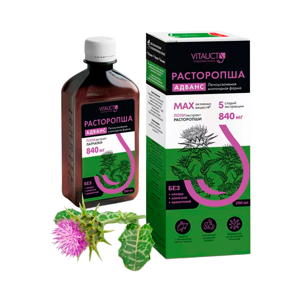 Плоды расторопши пятнистой (Silybum marianum L., сем. Asteraceae) широко применяются при заболеваниях печени, а также после химиотерапии, для предотвращения развития гепатопатий лекарственной этиологи. Расторопша способна предотвращать образование высокоактивных повреждающих соединений или связывать их, способна оказывать противовоспалительные действия, антифибротические свойства, стимулирует регенерацию печени и естественный метаболизм при патологии печени.